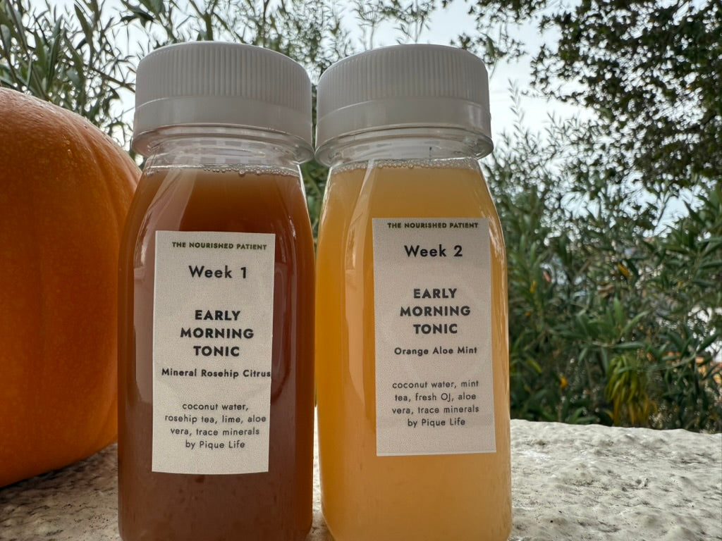4 complete texturally modified meals, a daily treat, and a hydrating early morning tonic featuring Pique Life Electrolytes — blended, sip- and straw-friendly, and safe for the full 6 weeks of double jaw (orthognathic) surgery recovery.